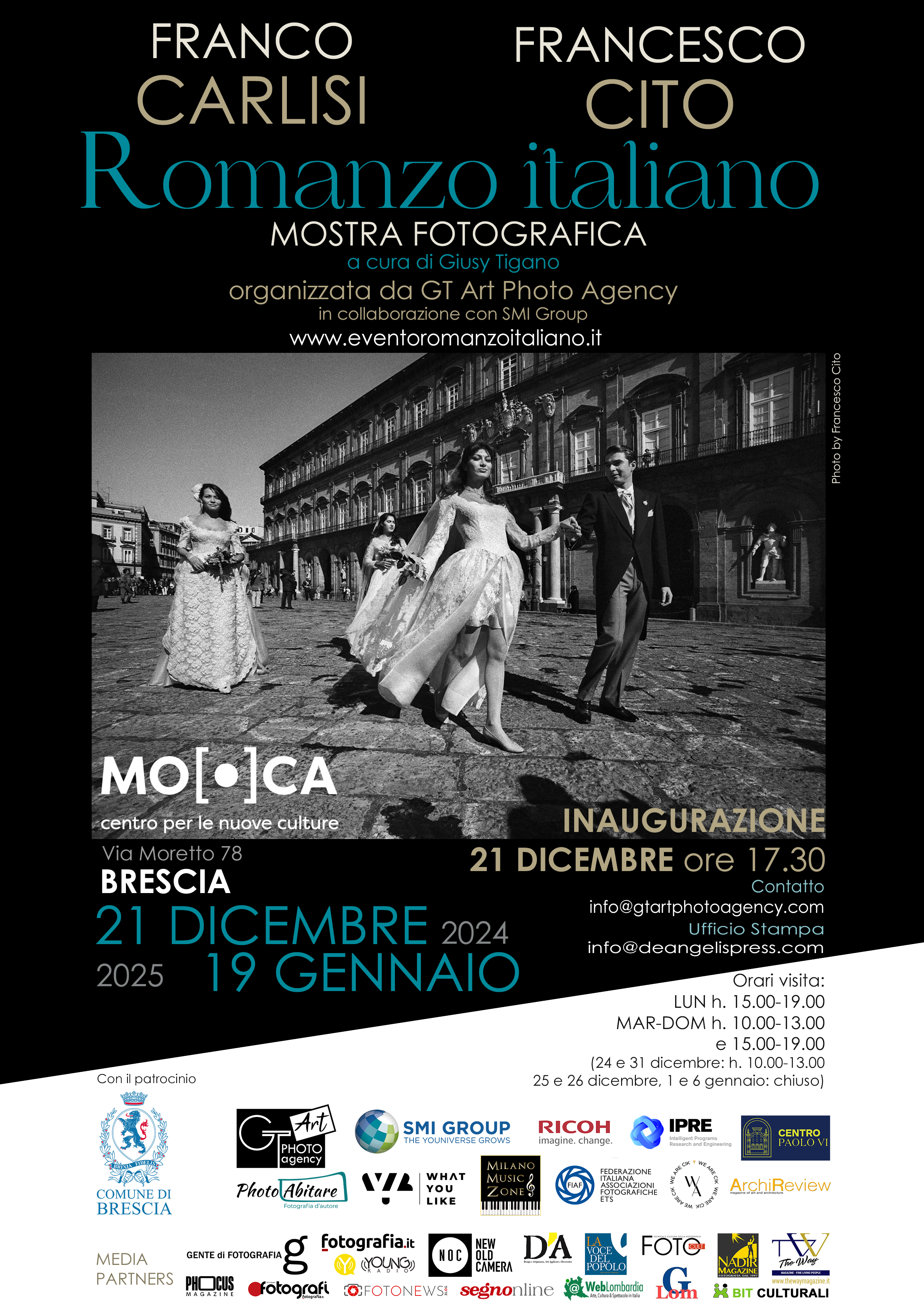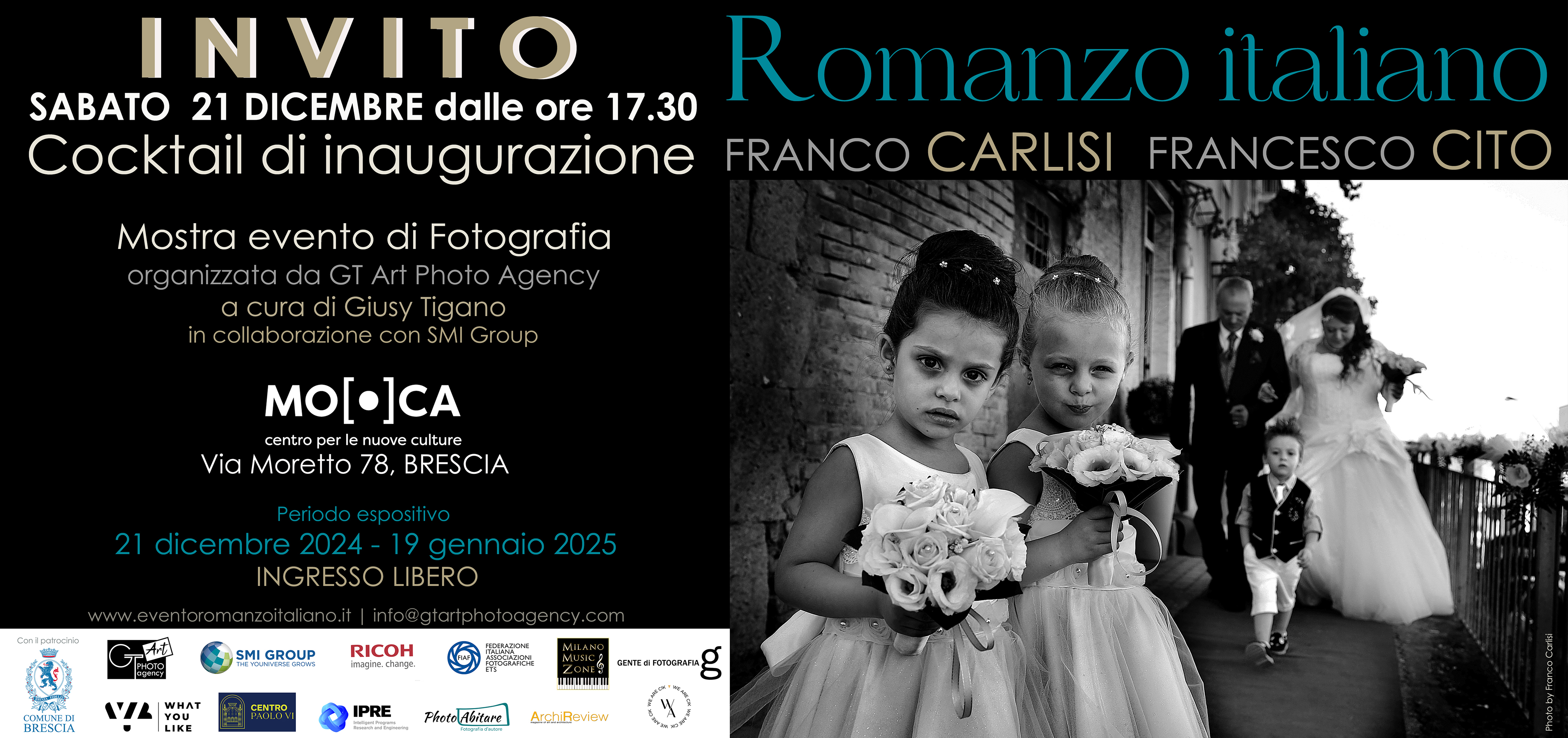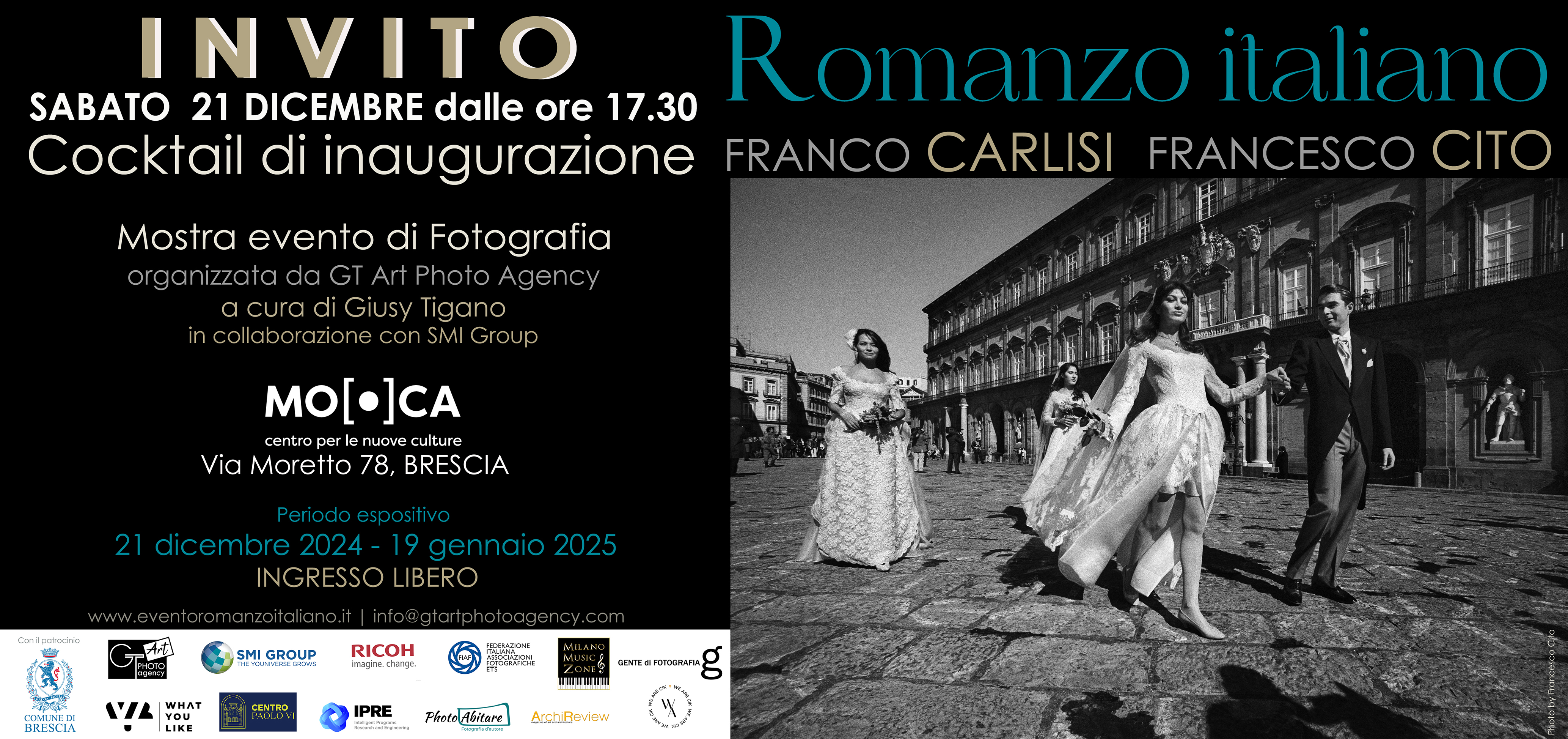 Si svolgerà dal 21 dicembre 2024 al 19 gennaio 2025 con il patrocinio del Comune di Brescia nello Spazio espositivo del MO.CA Centro per le nuove culture del Palazzo Martinengo Colleoni di Brescia la mostra “Romanzo italiano” con le opere fotografiche di Franco Carlisi e Francesco Cito.